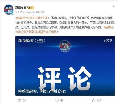 在2月3日下午新疆官方媒體“新疆發布”連續發布了兩條關于趙睿的消息,一方面是表達了自己的立場,堅決維護祖國統一和民族團結,另一方面也對趙睿這次不當的言行進行了抨擊?!靶陆l布”發文說“粉絲撐起了你,別傷了他們的心。賽場輸贏本來是競技體育的常態,勝負之間起起落落,則是體育魅力的一部分??墒潜绕鹳悎錾系慕Y果,運動員、教練員賽后言行舉動,更能展現個人職業素養和人格本質”。