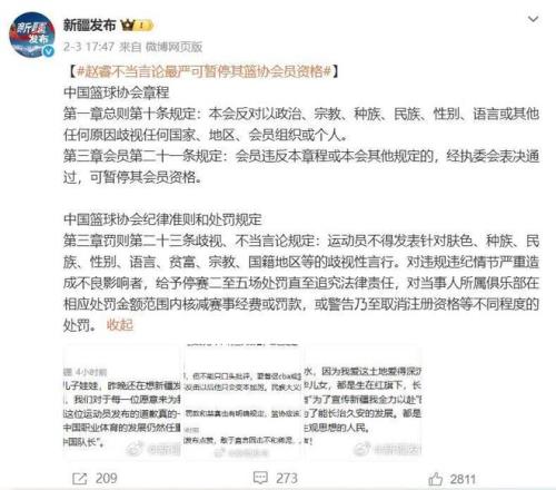 另外“新疆發布”還轉載了中國籃球協會章程,以及中國籃球協會紀律準則和處罰規定。其內容明確表示任何球員不得有以下這些行為或不當言論,會員違反本章程或本會規定的,經執委會表決通過,可暫停其會員資格。對于造成不良影響的球員,可以處禁賽2-5場的處罰,情節較為嚴重的可以追究其法律責任,對于球員所在的俱樂部也會有相應的罰款或者是核減經費,嚴重的甚至會取消其注冊資格等。