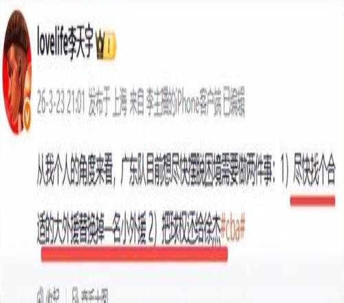 不過(guò)廣東球迷對(duì)李天宇表示認(rèn)可的同時(shí),還補(bǔ)充了一條,他們調(diào)侃李天宇說(shuō),”博主還是沒說(shuō)真話“、“再加一件杜峰下課”,大家都說(shuō),只有杜鋒下課才能解決問題,如果他還帶隊(duì),再來(lái)高大的外援可能也沒有用。他的用人讓廣東球迷傷心,好的不用,偏偏喜歡用那兩個(gè)老寒腿(指18和25號(hào))杜鋒一天不離開廣東隊(duì),球隊(duì)的困境就不能擺脫。你們說(shuō)呢?