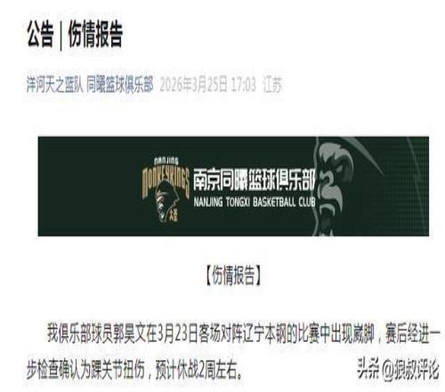 北京時間3月25日,根據南京同曦官方社媒公示,我俱樂部球員郭昊文在3月23日客場對陣遼寧本鋼的比賽中出現崴腳,賽后經進一步檢查確認為踝關節扭傷,預計休戰2周左右。衷心感謝大家對郭昊文及南京天之藍隊的關心與支持。