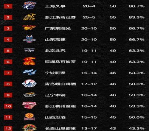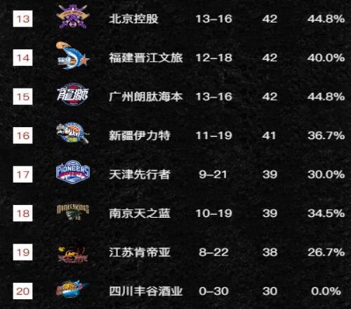 北控第十三,福建憑借著出色的發揮來到了第十四名,廣州隊第十五、新疆隊掉到了第十六名的位置,天津隊第十七名、南京隊第十八名、江蘇隊第十九名、四川隊三十連敗第二十名!