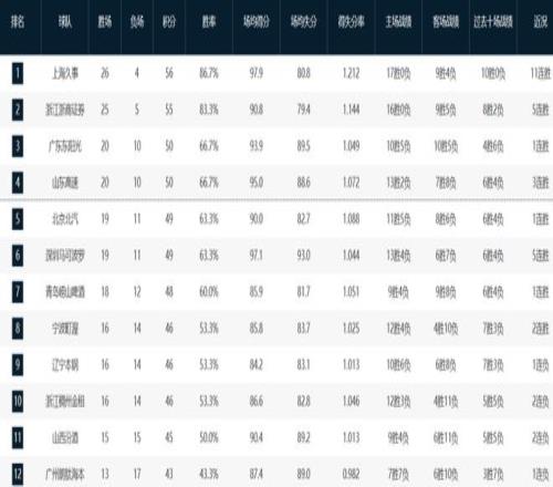 本賽季至今,上海隊以26勝4負繼續高居聯盟第一,衛冕冠軍廣廈隊25勝5負緊隨其后。