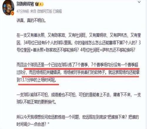 張昊嘉打了30分鐘,全場只有4次出手,拿到5分,卻貢獻了4次犯規(guī),在場輸6分。如果他的時間能讓出10分鐘給陳家政也許就拿下比賽了。媒體人對杜鋒重用張昊嘉感到非常不滿,別跑剛背豬質(zhì)疑杜鋒的用人,他不點名的吐槽張昊嘉,“這個球員還是一個已經(jīng)在球隊練了7個賽季,7個賽季場均分沒有一個賽季超過8分,而且場場犯關(guān)鍵錯誤,場場被對手挑著打的軟柿子。就這表現(xiàn)場均還能拿到13.1分鐘的上場時間呢。”他還怒斥道,“一支球隊輸球不可怕,成績差也不可怕,可怕的是能者上不去,庸者下不來,一支球隊不能正常的更新?lián)Q代。”從點評可以看出,媒體人對杜鋒重用張昊嘉意見非常大。