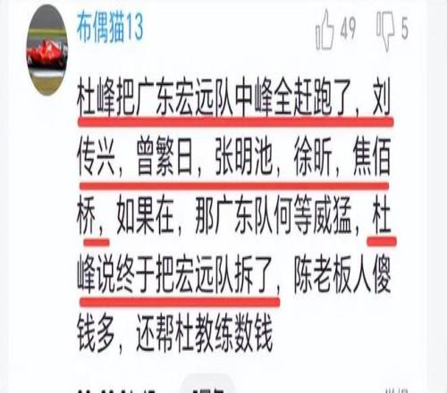 杜鋒把廣東隊坑慘了。球迷說“杜峰把廣東宏遠隊中鋒全趕跑了,劉傳興,曾繁日,張明池,徐昕,焦泊喬,如果還在,那廣東隊何等威猛,如今把廣東宏遠隊拆了”。送走徐昕后,又逼退焦泊喬,如果內線無人可用,場場內線被打爆,請問杜鋒,你到哪里買后悔藥!?