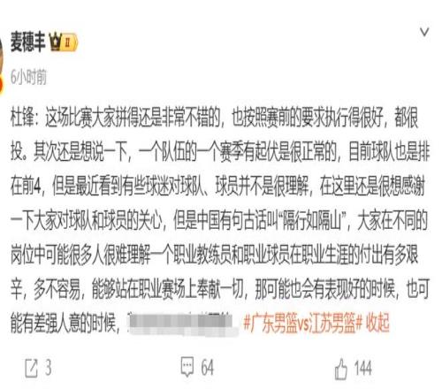 賽后杜鋒罕見在發布會上喊話廣東球迷要包容球隊(杜鋒說了將近5分鐘,非常少見),還說了很多話鼓勵和肯定張皓嘉這段時間的貢獻。