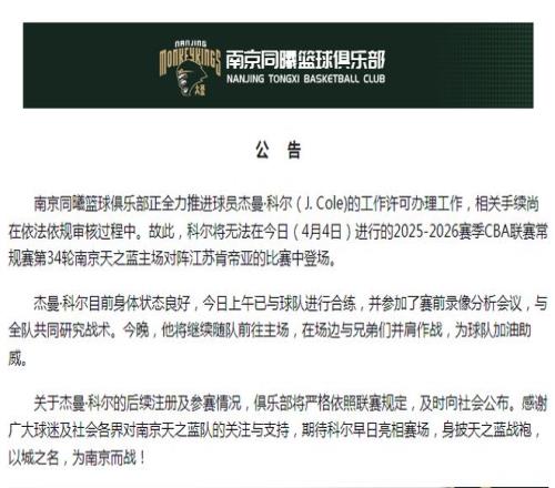 南京同曦籃球俱樂部正全力推進球員杰曼-科爾的工作許可辦理工作,相關手續尚在依法依規審核過程中。故此,科爾將無法在今日(4月4日)進行的2025-2026賽季CBA聯賽常規賽第34輪主場對陣江蘇男籃的比賽中登場。