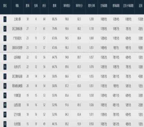 最后看看最新的排名,前四名變成上海隊(30-4)、廣廈隊(27-7)、廣東隊(23-11)和深圳隊(23-11),具體如下: