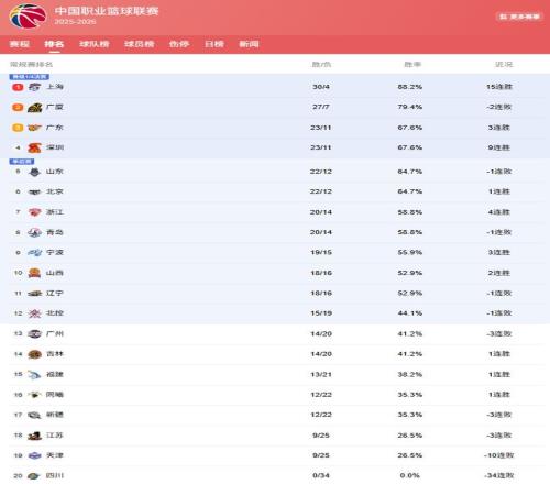 在第3爭奪戰中,山東和北京隊表現都有些下滑,他們也被拉開差距,落后廣東、深圳1場勝負差,同為22勝12負,爭奪第5的位置!