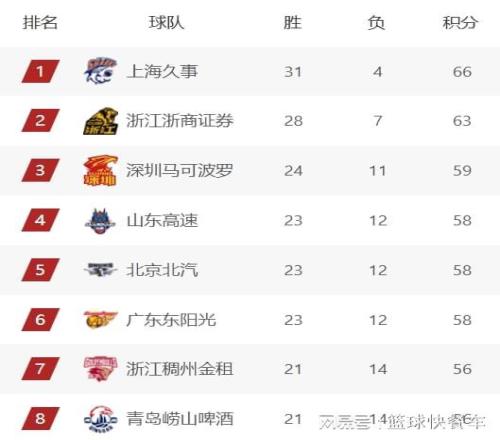 積分榜第7名是浙江隊,他們的戰績為21勝14負,青島隊這一輪比賽在客場掀翻山西隊,戰績也變成21勝14負,排在積分榜第8名。寧波隊這一輪比賽雖然爆冷輸給天津隊,不過,他們的排名不降反升,從積分榜第10變成第9。四冠王遼寧隊,他們則下滑到積分榜第十名。第11名則屬于山西隊,這一輪比賽過后,他們的戰績變成18勝17負,至于季后賽守門員位置,則屬于北控隊。