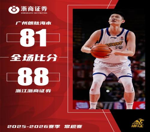 4月6日,CBA常規賽第35輪,浙江浙商證券客場挑戰廣州朗肽海本。首節雙方對抗激烈,比分交替上升,第二節浙商證券男籃找到三分手感,外線頻頻命中,迅速將比分拉開到兩位數,第三節廣州朗肽海本加強防守端的身體對抗,一度將比分迫近,第四節浙商證券充分發揮內線優勢,多次搶下前場籃板打進,最終,浙江浙商證券88-81戰勝廣州朗肽海本終止連敗。