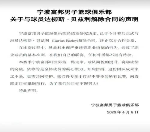 這一行為徹底觸碰了寧波男籃的底線。賽后不到一小時,俱樂部火速發布官方公告:“經研究決定,即日起與貝茲利解除合同,終止合作關系。其在比賽中嚴重違背職業道德,違反職業球員基本準則。在我們自己的聯賽,任何外援都不擁有特權?!贝朕o強硬,立場清晰,無一絲妥協。