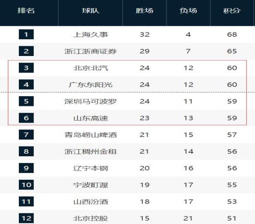 北京男籃目前24勝12負,暫列第三;廣東男籃也是24勝12負,暫列第四;深圳男籃24勝11負,少打一場比賽,暫列第五;山東男籃23勝13負,暫列第六。后面的青島、浙江、遼寧等球員落后稍微多一點,爭前四應該沒有希望了,主要是北京、廣東、深圳、山東這四支球隊爭奪前四,直白一點就是爭第三和第四。前四不需要打季后賽首輪,直接晉級八強,季后賽還有主場優勢。