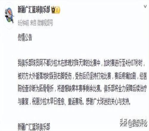 我俱樂部球員阿不都沙拉木在昨晚對陣天津的比賽中,加時賽進行至4分07秒時,被對方大外援落地時踩到右腳受傷,受傷后仍堅持打完比賽,賽后疼痛加劇,經醫院檢查診斷為跖骨骨折,將遺憾缺席本賽季剩余比賽。