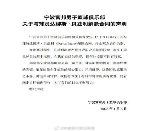 在8日晚與上海隊的比賽中,本賽季常規賽第二階段加盟寧波隊的外援貝茲利在發底線球時出現失誤,此后他情緒失控,與隊友發生了口角并推了隊友一把。沖突發生后,寧波男籃教練組立即讓貝茲利離場返回更衣室。比賽結束后,球隊做出了與他解約的決定。“貝茲利出現嚴重違背職業道德的行為,違反了職業球員的基本準則,在我們自己的聯賽,任何外援都不擁有特權。”寧波男籃在官方聲明中寫道。