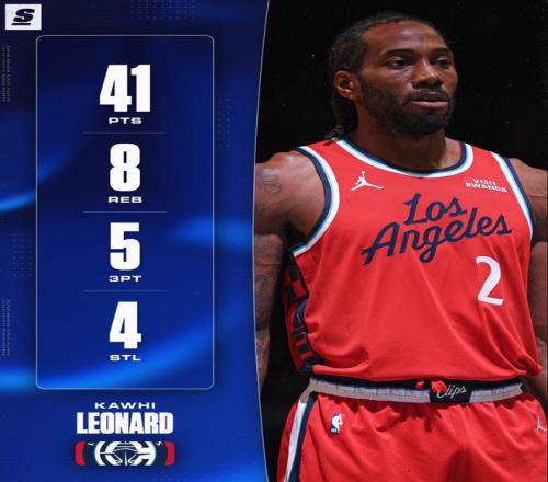 倫納德這場比賽34分鐘,30中14,三分11中5,罰球10中8,拿到41分8籃板2助攻4搶斷,命中率46.7%,三分命中率45.5%,真實命中率59.6%,正負值+20。