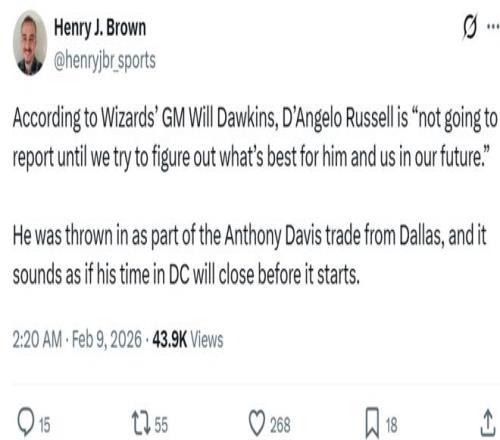 完成交易之后,不僅濃眉哥對于加盟魚腩奇才隊不感興趣,雙方合作計劃一波三折,作為添頭的拉塞爾也被曝出不愿意前往奇才報到。