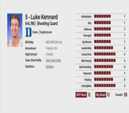 NBA選秀網站綜合評分93分,預計選秀順位12順位,實際選秀順位12順位,選秀模板:尼克-斯陶斯卡斯/杰夫-霍納塞克.