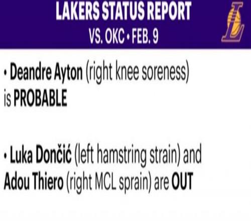湖人東契奇因左腿筋傷勢繼續(xù)缺陣,蒂耶羅(右膝內(nèi)側(cè)副韌帶扭傷)也無法出戰(zhàn)。