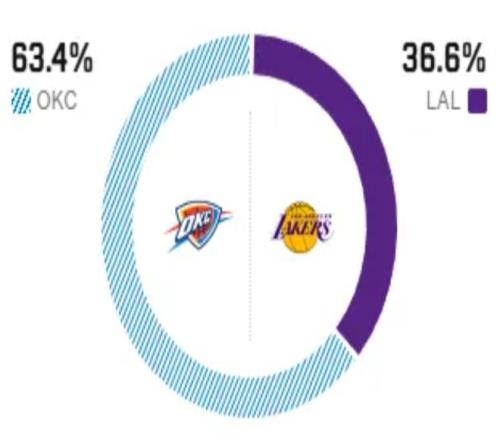 賽前,美媒ESPN對本場比賽進行了勝率預測,湖人隊勝率僅有36.6%雷霆勝率則高達63.4% ,差距非常明顯。