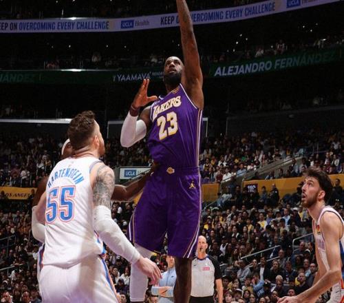 進入下半場,杰威率先上籃,八村塁三分回應后,老詹繼續造殺傷+喂餅斯瑪特,此后老詹繼續突破上籃,助攻拉拉威亞再中三分球,湖人一波流追上打停雷霆。暫停回來,老詹繼續軍訓哈騰,拉拉威亞連續強攻罰球,老詹也續上單打,湖人最多領先雷霆8分。后半段杰林連拿8分,又輪到雷霆的罰球回合,節末卡魯索命中三分球,三節打完,雷霆93-91湖人。決戰第四節,斯瑪特連續命中三分,卡魯索內外開花回應,中段里夫斯和艾頓輪流失誤,杰威和霍姆格倫繼續上分。