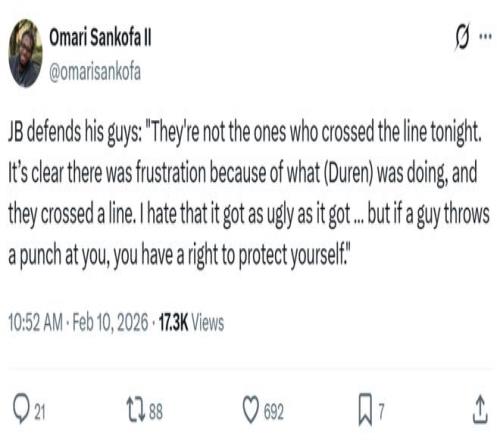 接著杜倫一把推在迪亞巴特的臉上升級沖突,被點燃的迪亞巴特直接揮拳反擊,好在杰倫杜倫閃躲及時,加上一旁的哈里斯玩命拉架,才讓迪亞巴特揮拳落空沒有導致沖突進一步升級。