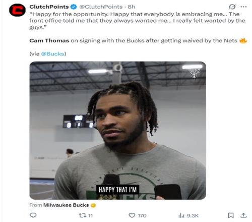 托馬斯在簽約雄鹿后接受采訪,他說道:很高興能有這個機會加盟雄鹿,也很高興大家接納了我,球隊管理層告訴我,他們一直都希望我能加入,我能感受到隊友們的認可。
