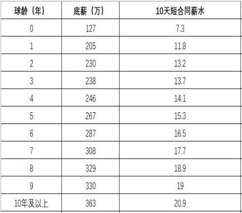 在NBA中,不同球齡(也就是NBA經(jīng)驗)球員的底薪是不同的,因此他們簽10天短工合同的薪水也不同,具體我們看下表: