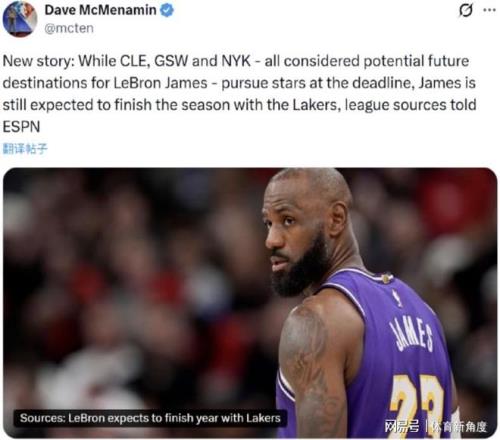 現在,咱們把目光聚焦到詹姆斯身上。知名記者Dave McMenamin爆料,騎士、勇士和尼克斯,這三支球隊就像三顆閃耀的星星,成為了詹姆斯未來可能的下家。然而,就在交易截止日日益臨近的關鍵時刻,詹姆斯卻做出了一個讓湖人球迷歡呼雀躍的決定——他將留在湖人,打完本賽季。這就好比在狂風暴雨中,湖人這艘大船終于找到了穩定的錨點。