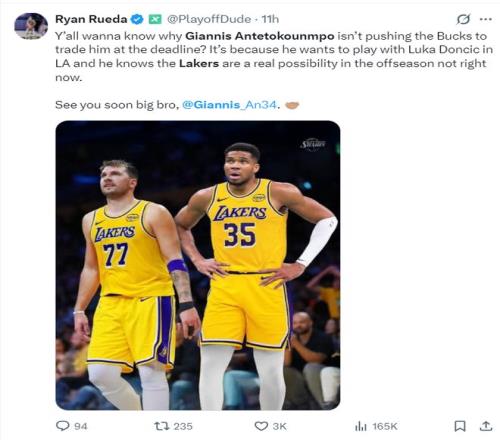 根據湖人記者Ryan Rueda的說法,雄鹿隊沒有在交易截止日前送揚尼斯的原因之一就是,字母哥希望在今夏與東契奇并肩作戰,而且他知道湖人在休賽期開出的籌碼會比交易截止日更好,也能幫助雄鹿隊。