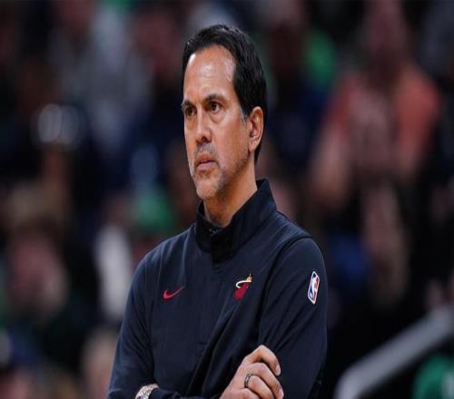 邁阿密熱火隊(duì)主教練埃里克·斯波爾斯特拉在TD花園球館場邊觀看球隊(duì)對陣波士頓凱爾特人隊(duì)的比賽。