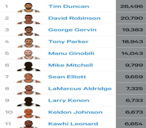 在得到這24分之后,凱爾登馬刺生涯總得分達到6673分,超越倫納德(6654分),升至隊史第十,且距離前面第九的拉里肯農(6733分、馬刺70年代名宿)也只差60分,不出意外的話,本賽季就能實現超越。
