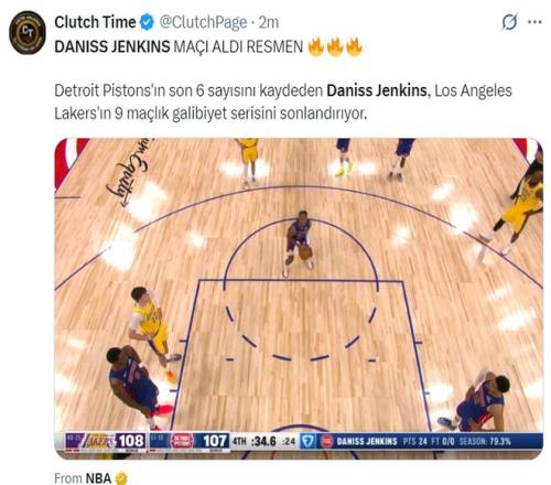 這一球命中后,東契奇終場前12秒急停中投不中,終場前9秒詹金斯控制球權后被犯規,他兩罰全中領先到3分,東契奇絕平三分三不沾,終場前34秒-9秒這25秒里就是詹金斯一人大戰湖人全隊。
