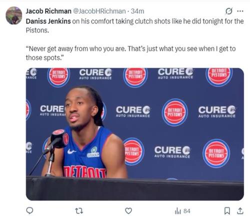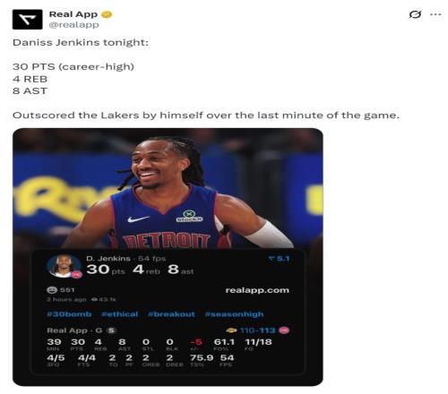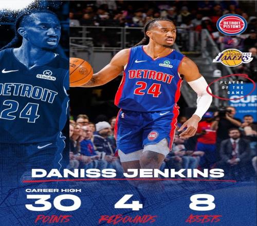 北京時間3月24日,活塞113-110擊敗湖人拿到4連勝。這場比賽活塞一度領先湖人16分之多,可在下半場被湖人瘋狂追分,末節湖人一度反超但進入決勝時刻詹金斯這位24歲的后衛統治了比賽,決勝25秒里他一人拿到6分幫助活塞涉險過關。
