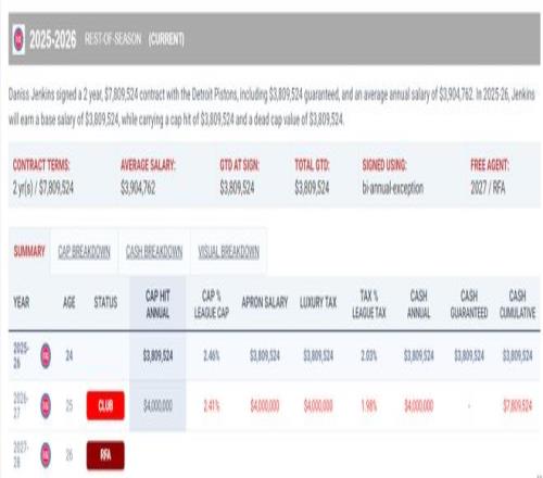 今年2月9日活塞才將詹金斯的雙向合同轉為正式合同,他實際上在2024年落選后就一直代表活塞出戰G聯賽/NBA,上賽季只打了7場比賽,但本賽季已經成為活塞核心輪換已經出戰61場。本賽季薪水為380萬(雙年特例簽約)