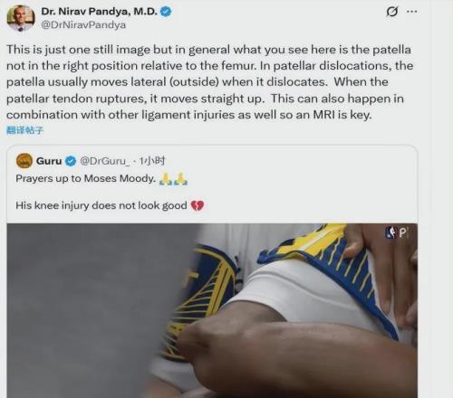 傷病專家Nirav Pandya對此表示:“穆迪有可能髕腱斷裂、髕骨脫位,以及多條韌帶損傷等等。”