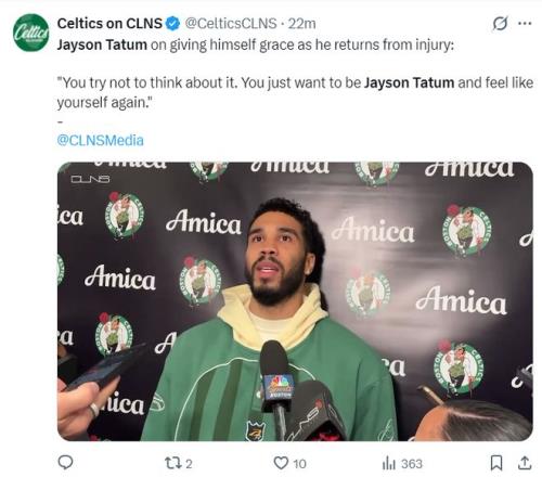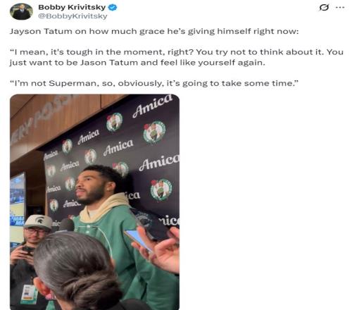 塔圖姆還說道:我從那些經歷過跟腱斷裂的球員、我的家人、醫護人員中獲得了一些慰藉,畢竟大傷后心理上的創傷跟身體一樣難以愈合。