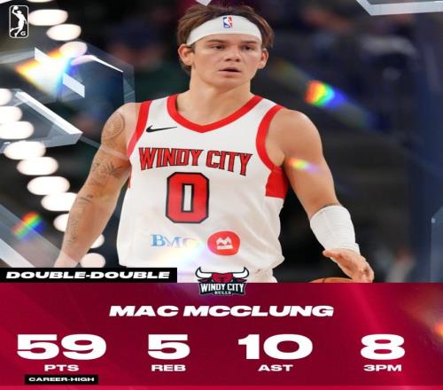 昨天在NBA發展聯盟,身披公牛下屬球隊球衣的麥克朗面對鵜鶘的“小號”伯明翰中隊,出戰42分鐘,34投19中狂轟59分10助攻5籃板,在三分線外17投8中。