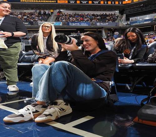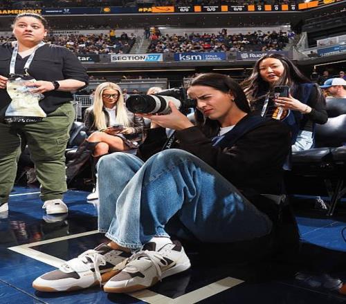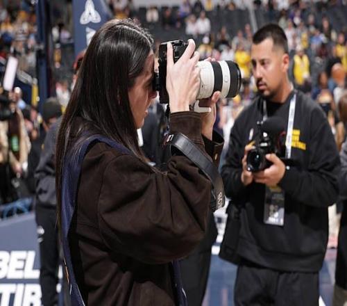 本場比賽,WNBA印第安納狂熱球星克拉克現場觀賽,并擔任場邊攝影記者,她身著攝影記者馬甲,手持搭配G大師70-200的索尼相機在場邊攝影區進行拍攝。