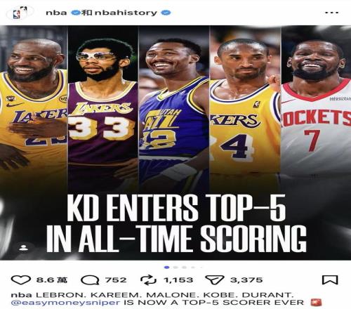 杜蘭特生涯總得分超越喬丹,成為歷史第五/圖片來源:NBA Instagram
