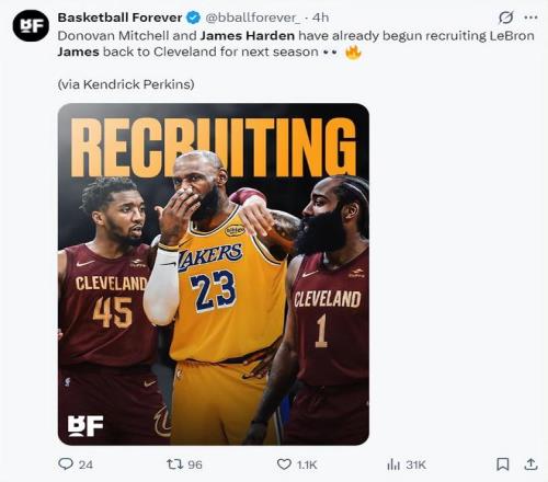 帕金斯還透露一個(gè)細(xì)節(jié),在今夏休賽期,米切爾與哈登兩人都會來說服詹姆斯簽約克利夫蘭,大家一起沖擊總冠軍。
