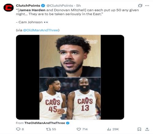 掘金球員卡梅倫-約翰斯在直播時(shí)談到哈登+米切爾的組合,他表示:騎士隊(duì)會變得非常強(qiáng)大,因?yàn)楣恰⒚浊袪杻扇硕际强梢砸粓?0+的球員,米登組合會非常之恐怖。