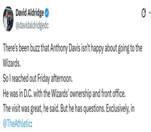 體育畫報資深NBA記者曼尼克斯曾在報道中稱,戴維斯“似乎對加盟奇才興致不高”,并在播客節(jié)目中再次強(qiáng)調(diào)這一觀點(diǎn)。但戴維斯表示,目前所見的一切都讓他心生好感。