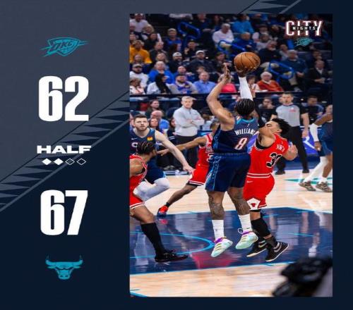 次節比賽,雙方均是單節得分30+展開對攻,但公牛本場首次單節得分35分。亞歷山大繼續外線打鐵,前兩節比賽公牛三分24中12,奧科羅17分、塞克斯頓6中6命中4記三分得到16分與米勒10分、吉迪4中1僅得到3+4+6。反觀雷霆三分24中7,亞歷山大14中5(三分7中0與罰球3中1)得到11分、杰倫11分與華萊士10分。雷霆單節33-35再輸2分,上半場結束雷霆62-67落后公牛。