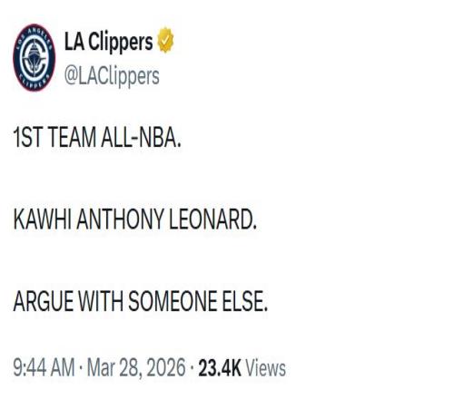 本場賽后,快船官方也是在社媒上為倫納德造勢:最佳陣容一陣,科懷安東尼倫納德,不接受任何反駁。