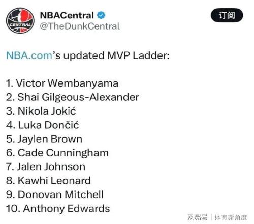 本賽季截至目前,約基奇已經出戰59場比賽,場均能夠轟下27.9分、12.8個籃板以及10.8次助攻,投籃命中率高達57.4%,三分命中率也有38.5%。值得一提的是,NBA官方公布的最新MVP排行榜中,文班亞馬強勢登頂,亞歷山大排名下滑至第二,約基奇則穩隨其后,東契奇位列第四。