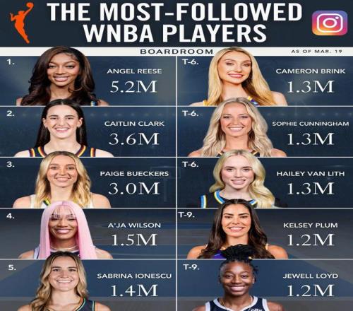 美媒boardroom統計了WNBA球星的社媒粉絲數排名,美國女籃三位超新星占據前三。芝加哥天空隊的安吉爾-里斯斷...