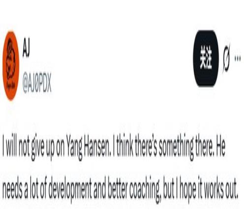 球迷AJ發(fā)文寫(xiě)道:“我絕不會(huì)放棄對(duì)楊瀚森的期待。我相信他身上是有潛力的。他確實(shí)需要大量的打磨提升,也需要更優(yōu)質(zhì)的指導(dǎo),但我真心希望他能越來(lái)越好?!?/p>