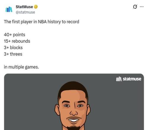 第2、文班亞馬是歷史上首個多場比賽砍下40分+15籃板+3記三分+3記蓋帽的球員。