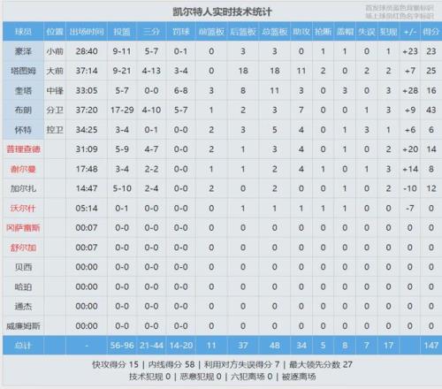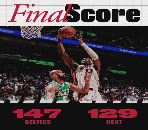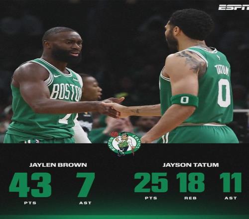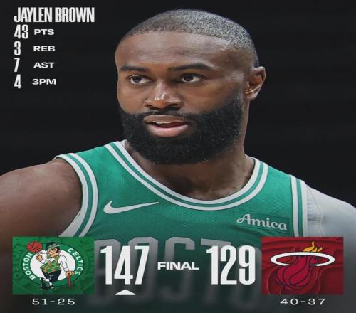 阿德巴約21投10中,三分10中5,罰球8中4,拿到29分10板2助2斷,正負值-23并列全場最低。綠軍雙探花爆發:杰倫-布朗29投17中,三分10中4,罰球7中5,砍下43分4板7助。他本賽季7次砍下40+,此前9個賽季一共10次。