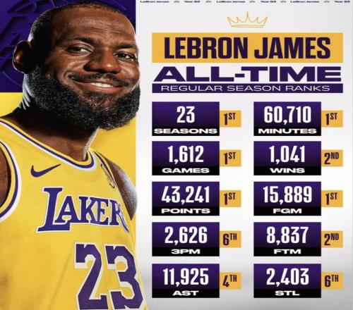 截至目前,詹姆斯的常規賽總得分(43241分)、總出場數(1612場)、總出場時間(60710分鐘)以及投籃命中數(15889個),全都已經是歷史第一。
